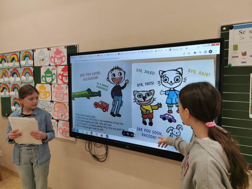 Zadanie 10-Kącik książki po angielsku -stworzenie klasowego kącika książki, wspólne i indywidualne czytanie. Dodatkowo Helena i Alicia odwiedziły uczniów klasy 1a i przeczytały im całą książkę Kitty Kotty can’t sleep.