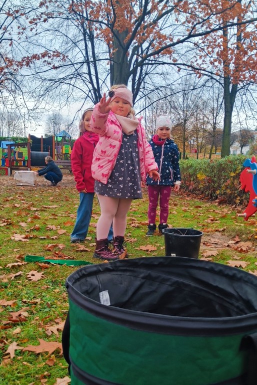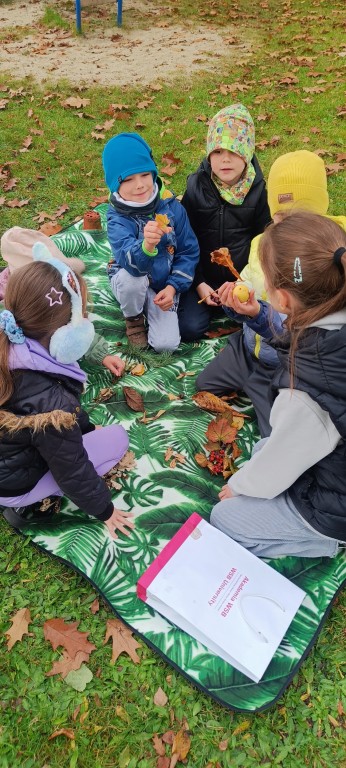 Podczas krótkiego odpoczynku, tym razem już na przedszkolnym dywanie, dzieci wsłuchały się w opowieść o jeżyku Tuptusiu, który nauczył się, że każdy – nawet najmniejszy – może zrobić coś dobrego dla przyrody i że jak połączymy siły to z małych rzeczy może powstać coś wielkiego i wspaniałego. To przesłanie pięknie towarzyszyło nam przez cały czas trwania zajęć.